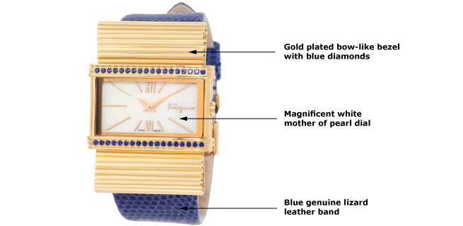 The sultry and exotic Ferragamo Women's Renaissance Blue Genuine Lizard Leather Gold Plated Mother-Of-Pearl Watch is a real catch that should be brought back to your jewelry collection right away. The blue genuine lizard leather band and gold-plated bow-like bezel with blue diamonds give the watch the perfect combination of class and beauty. The magnificent white Mother-Of-Pearl dial is protected by a scratch-resistant sapphire crystal and features gold-toned hour markers, including Roman numeral markers at the 6 and 12 'o clock positions. The Swiss quartz movement will keep you precisely on time. This gorgeous watch remains securely on the wrist thanks to an elegant deployment buckle clasp.